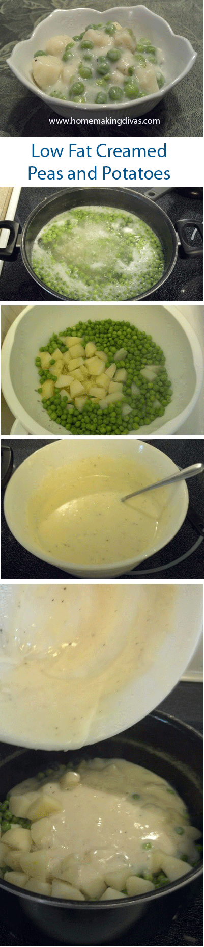 Creamed Peas and Potatoes are usually made with a lot of butter and cream. This low fat recipe is made with 1% milk. The Chicken Broth Granules make this recipe taste like it is loaded with butter. Make extra because this recipe freezes very good.